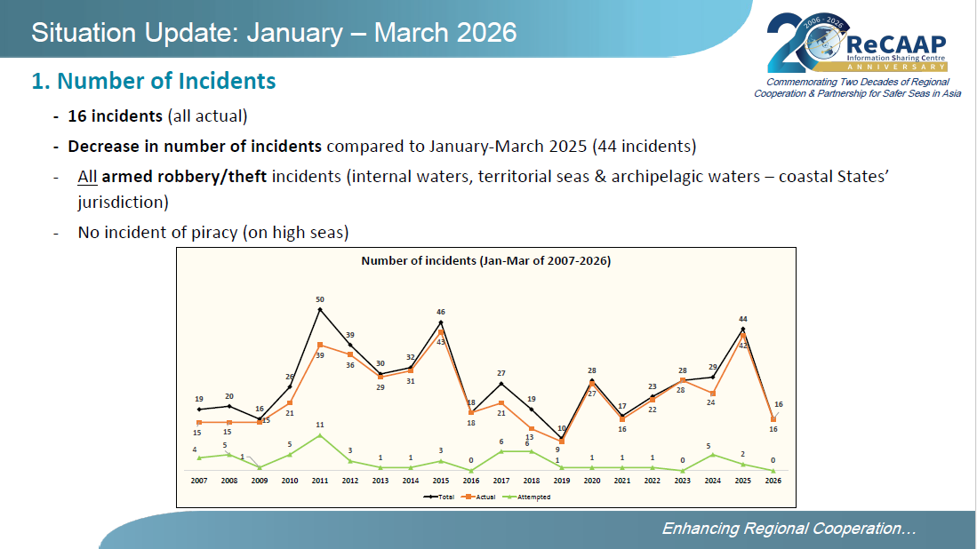 ReCAAP ISC's periodic reports help the maritime community combat piracy and sea robbery in Asia by by sharing detailed information of the incidents such as locations, modus operandi and good practices, in order to raise awareness on the risks and strengthen safety measures.