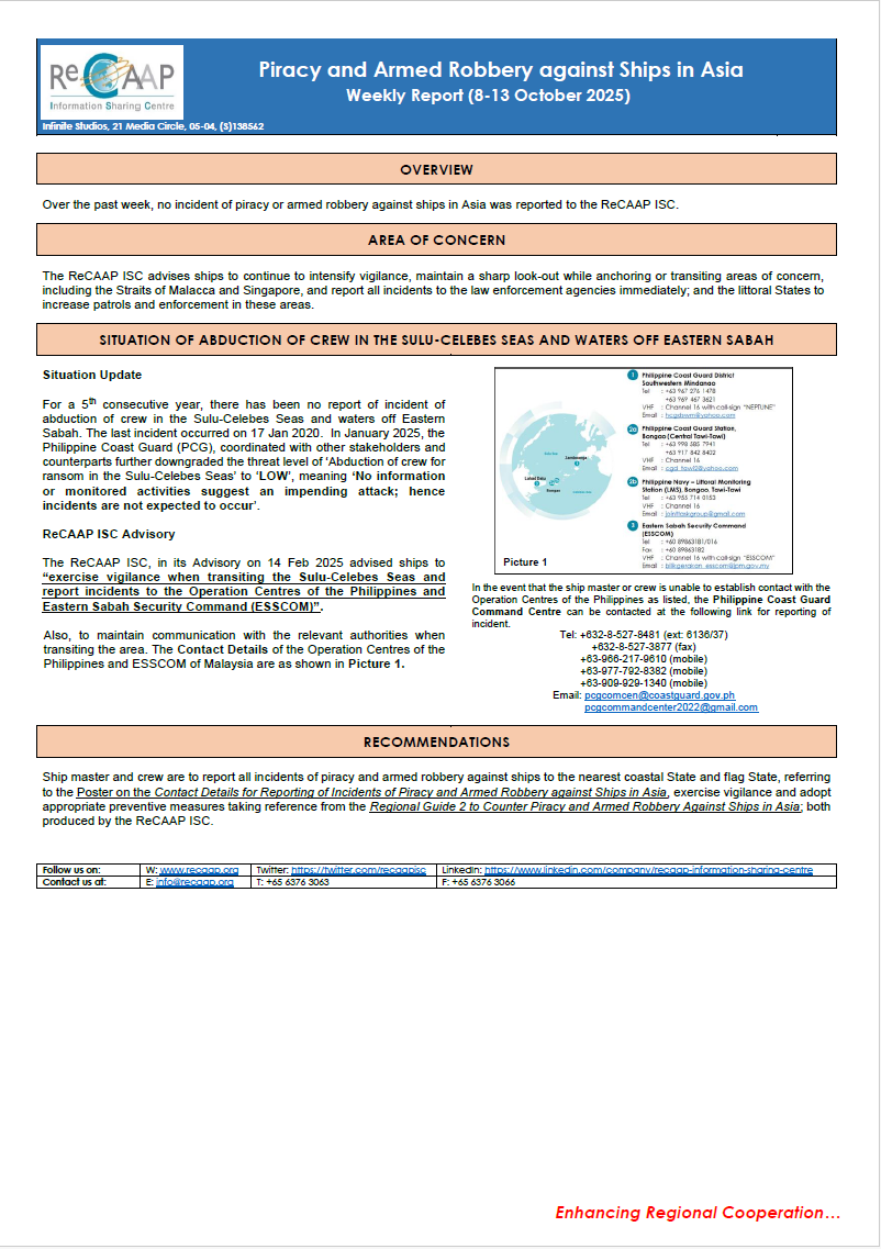 ReCAAP ISC Weekly Report (8-13 Oct 2025)