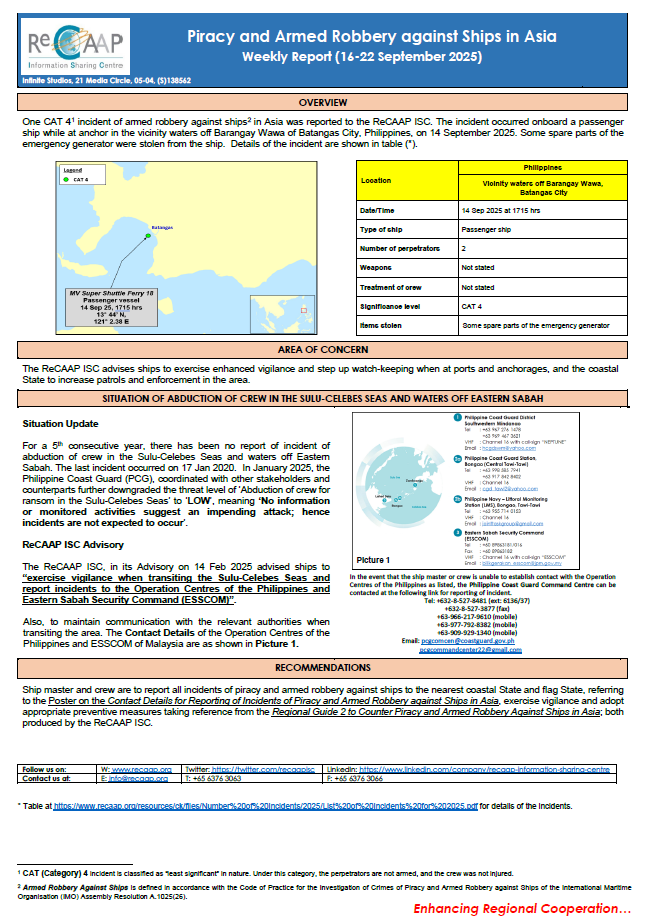 ReCAAP ISC Weekly Report (16-22 Sep 25)
