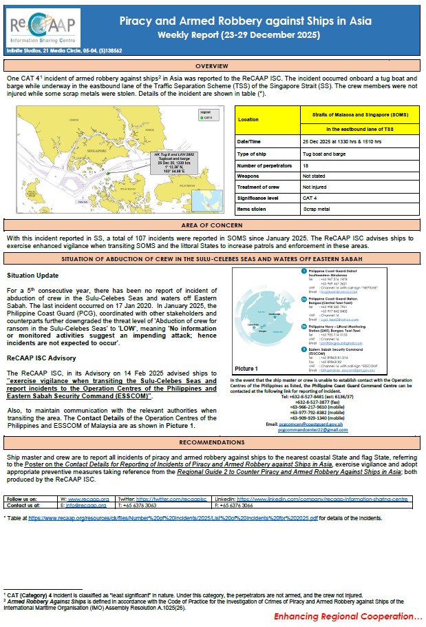 ReCAAP ISC Weekly Report (23-29 Dec 25)
